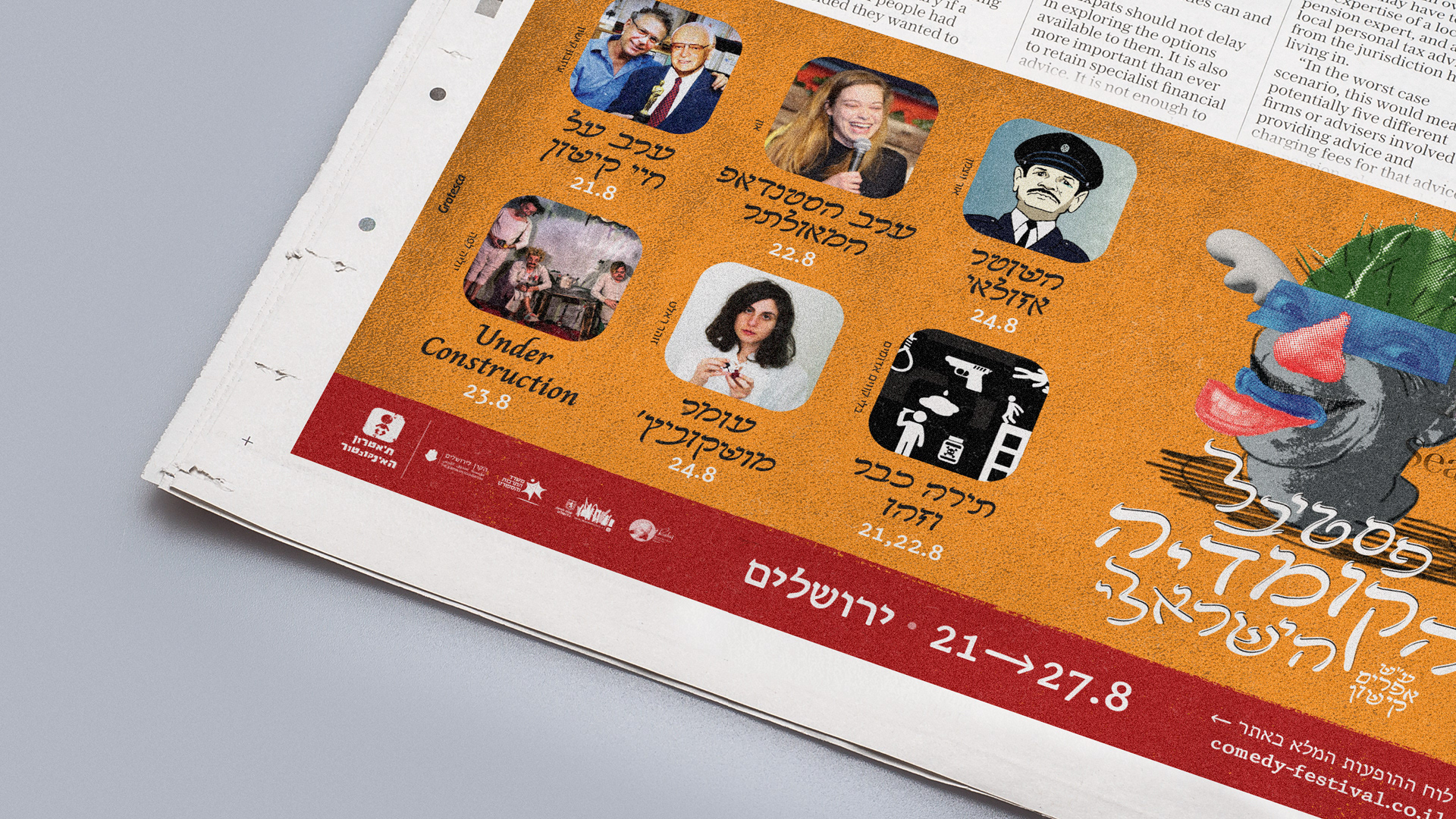 פסטיבל הקומדיה הישראלי ע״ש קישון, מבית תיאטרון האינקובטור. יצרנו עבורו שפה קוצנית, מחוספסת וצבעונית, ודאגנו להשתמש בה בכרזות, באתר, בתוכניה ועוד תוצרים קופצניים כאלה ואחרים.