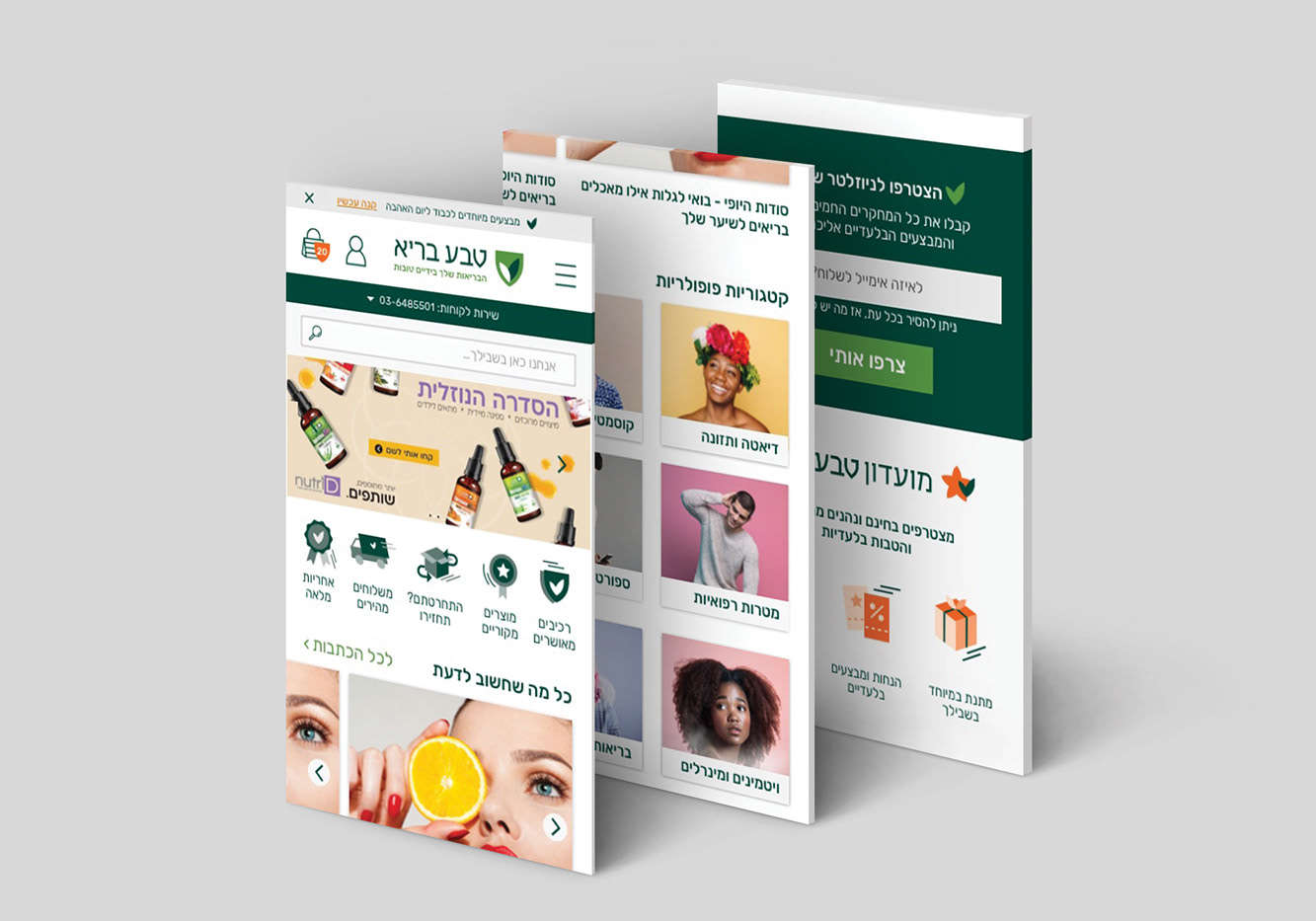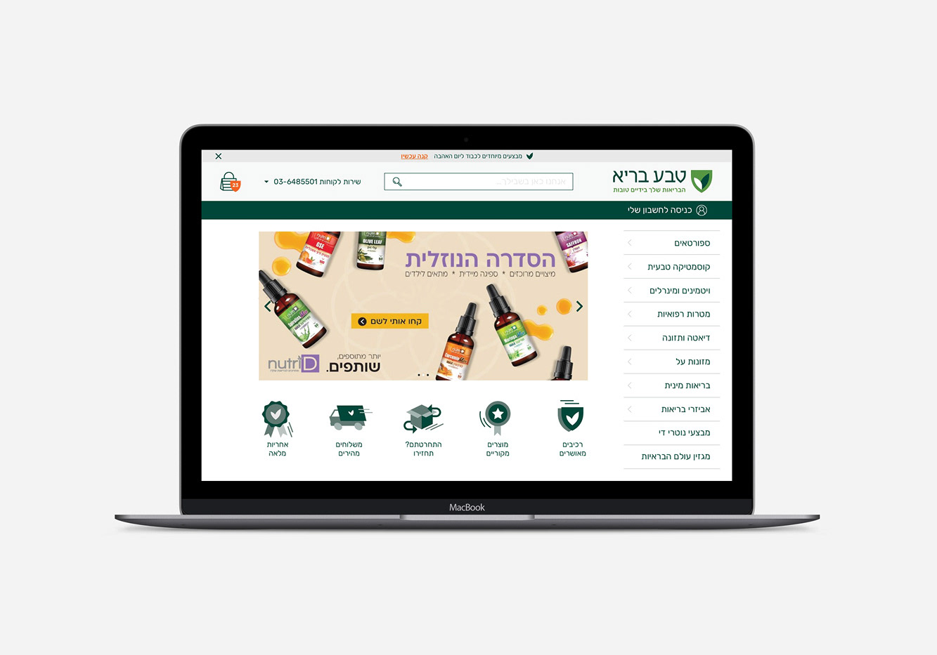 מיתוג מחדש לטבע בריא - הבריאות שלך בידיים טובות, אתר איקומרס מוביל למוצרי בריאות, תזונה וספורט . עיצבנו סט רחב של פתרונות חזותיים החלק מלוגו חדש, דרך האריזות וכלה באתר שעבר מתיחת פנים